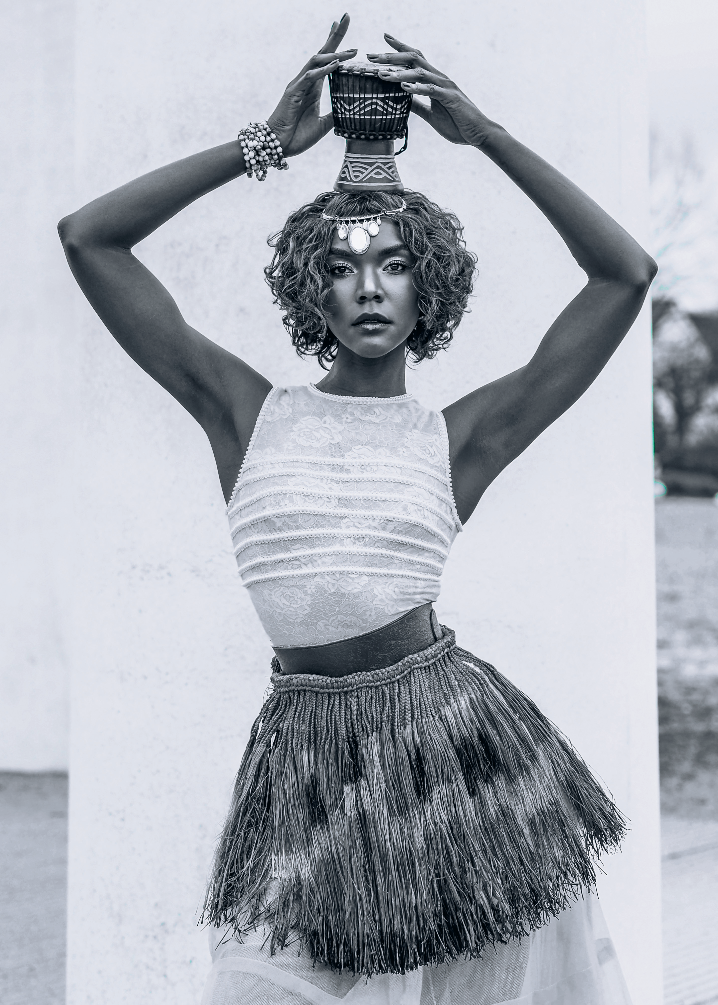 Moi, j’ai eu la chance de vivre et de grandir en Centrafrique jusqu’à l’âge de 13 ans et il y a pas mal de choses que mes parents m’ont inculquées car cela leur semblait important pour moi, même si mon pays est francophone et que j’allais dans une école française. Ils m’ont inculqué des valeurs africaines et centrafricaines et je leur en sais gré. Quand je vais en Afrique, j’amène ou je ramène des tissus comme cette jupe en paille, tenue traditionnelle qui vient du village de ma grand-mère. Et j’essaie de valoriser et de rendre beau ce que l’on a tendance parfois à trouver pas forcément attirant… Voilà le sens de ma démarche visant à mélanger les cultures.